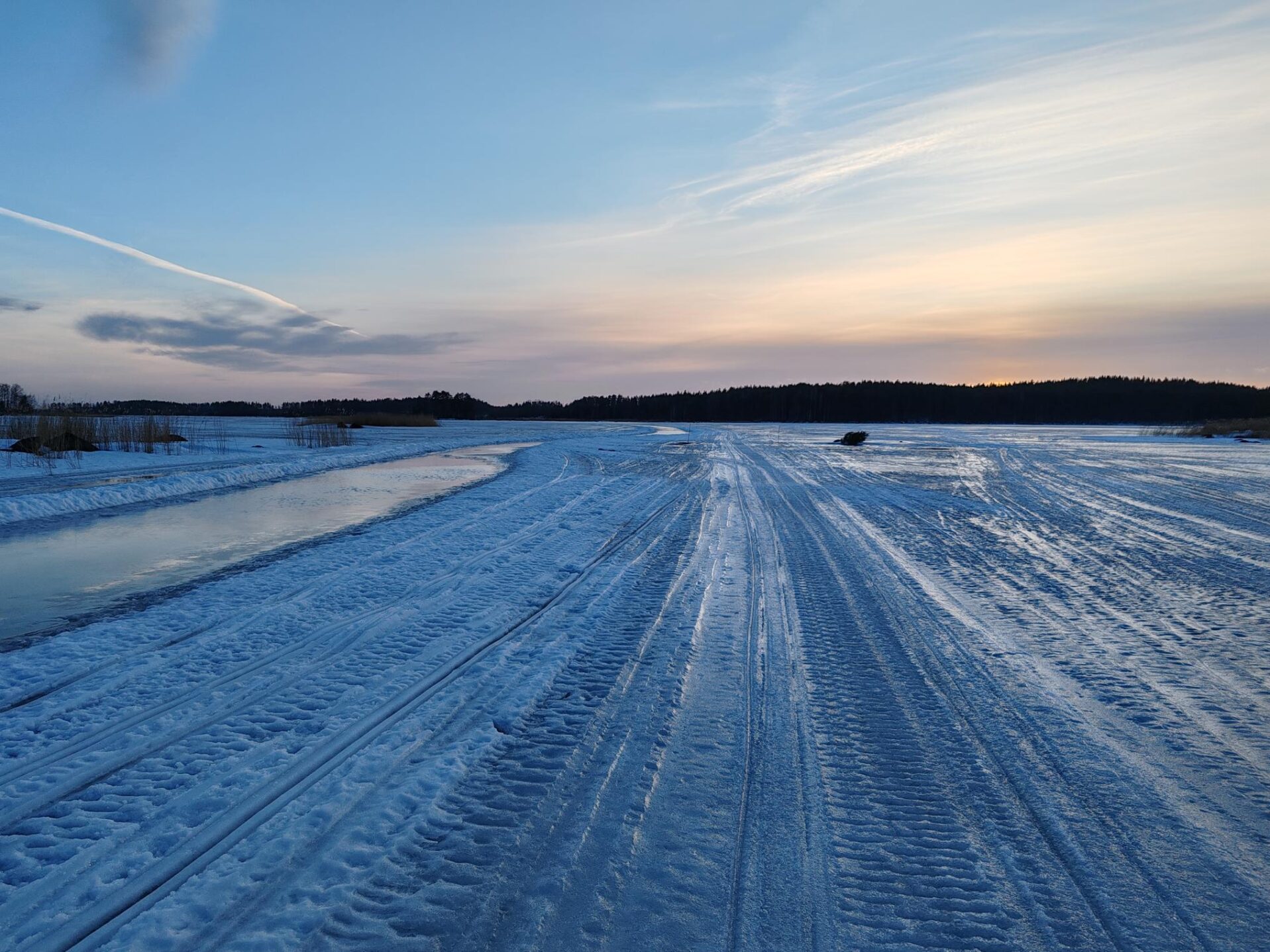 Maanantai 16.3. Jäällä ei ole enää juurikaan lunta eli hiihtämään ei pääse. Punaisin aurauskepein merkatulla moottorikelkkareitillä voi vielä kävellä. Pysy reitillä, koska nyt syntyy uveavantoja myös lähelle reittiä!