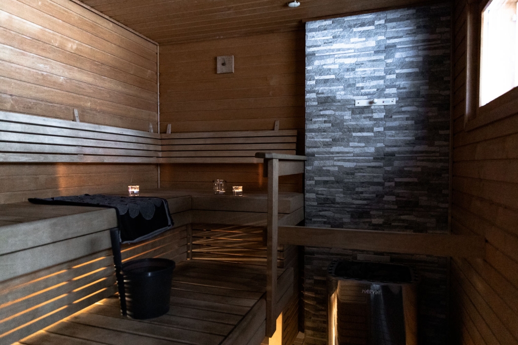 - Tilava sähkösauna järvinäköalalla. Suihkut sijaitsevat saunaosastolla.